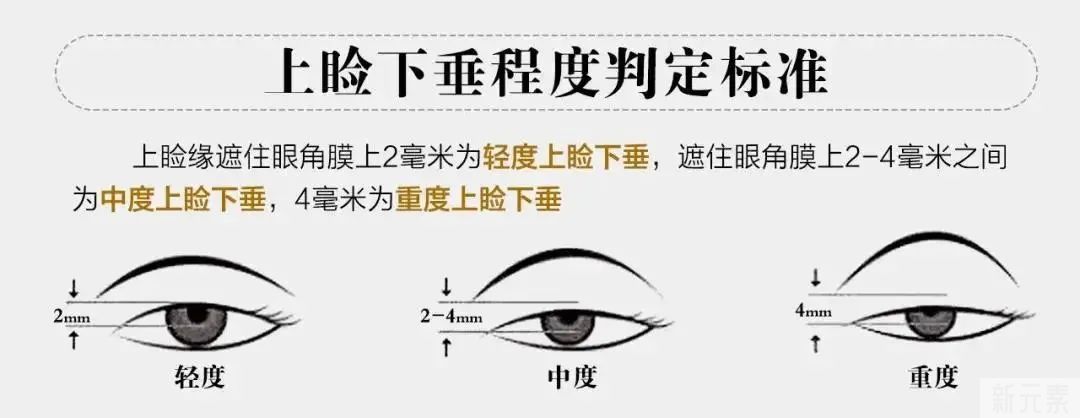 正常的眼睑覆盖角膜2mm以内;2mm以上为轻度下垂;3mm为中度下垂;4mm或4mm以上为重度下垂。